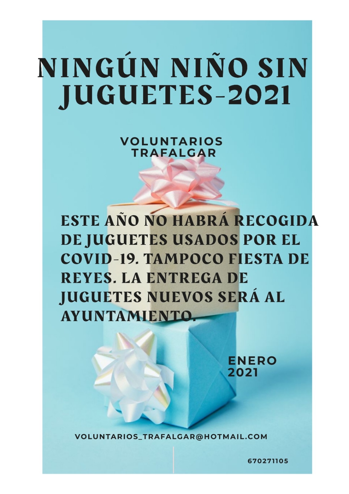 En reunión mantenida con el Ayuntamiento recibimos la lista de familias en situación de dificultades para adquirir juguetes para los más pequeñ@s. Ya hemos conseguido que la Fundación Social La Caixa nos haya ayudado con el 50% del importe que necesitamos, aún nos queda trabajo para lograr el resto. Esperamos que difundáis este cartel para que llegue a todo el mundo estos términos: No recogeremos Juguetes usados. No habrá Fiesta de Reyes Trafalgar 2021. Los Juguetes que compremos los entregaremos al Ayuntamiento para que desde Asuntos Sociales realicen el reparto. Salud y buenos deseos para el año nuevo.