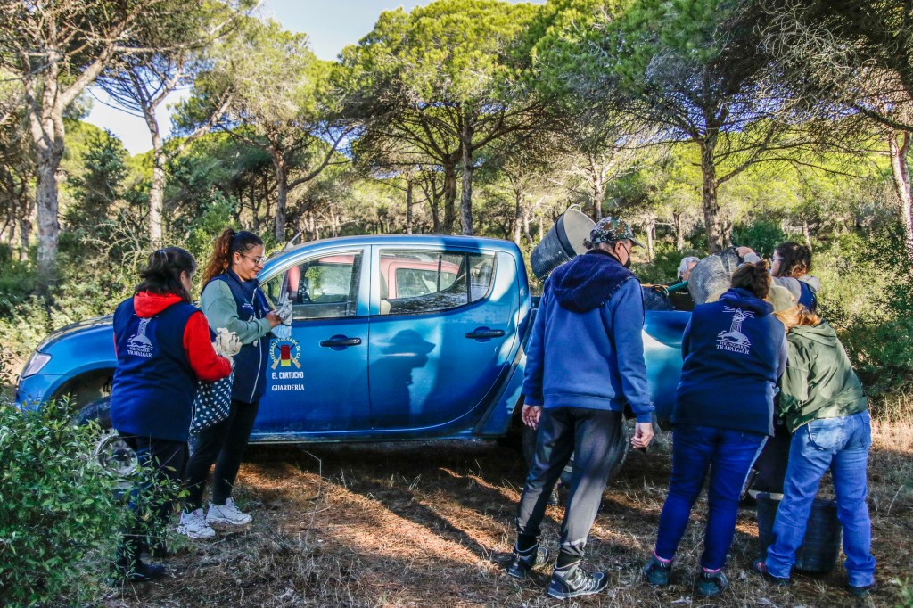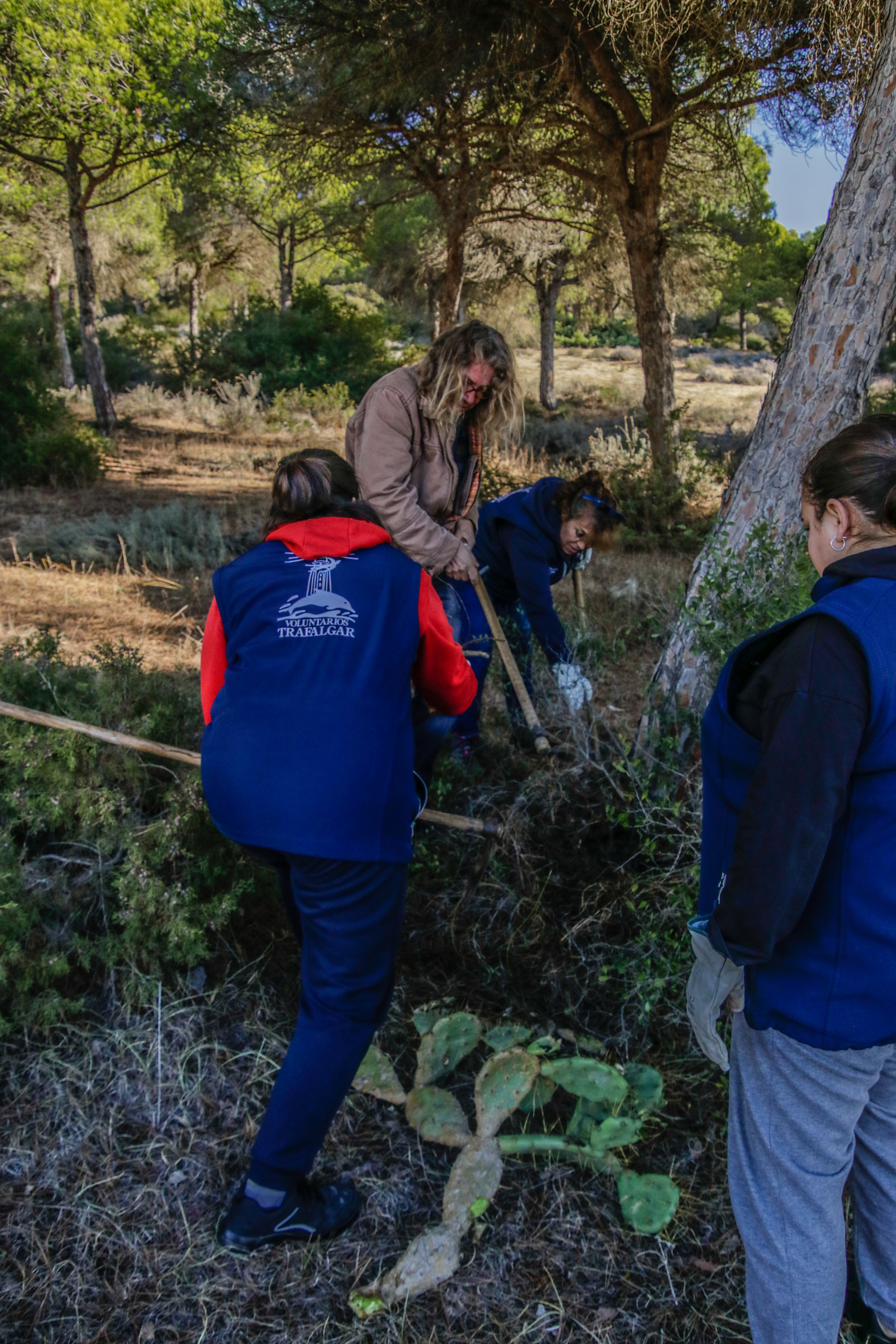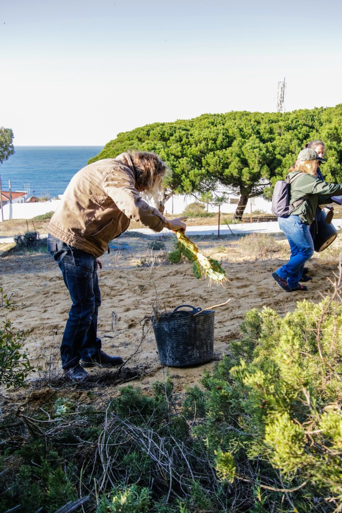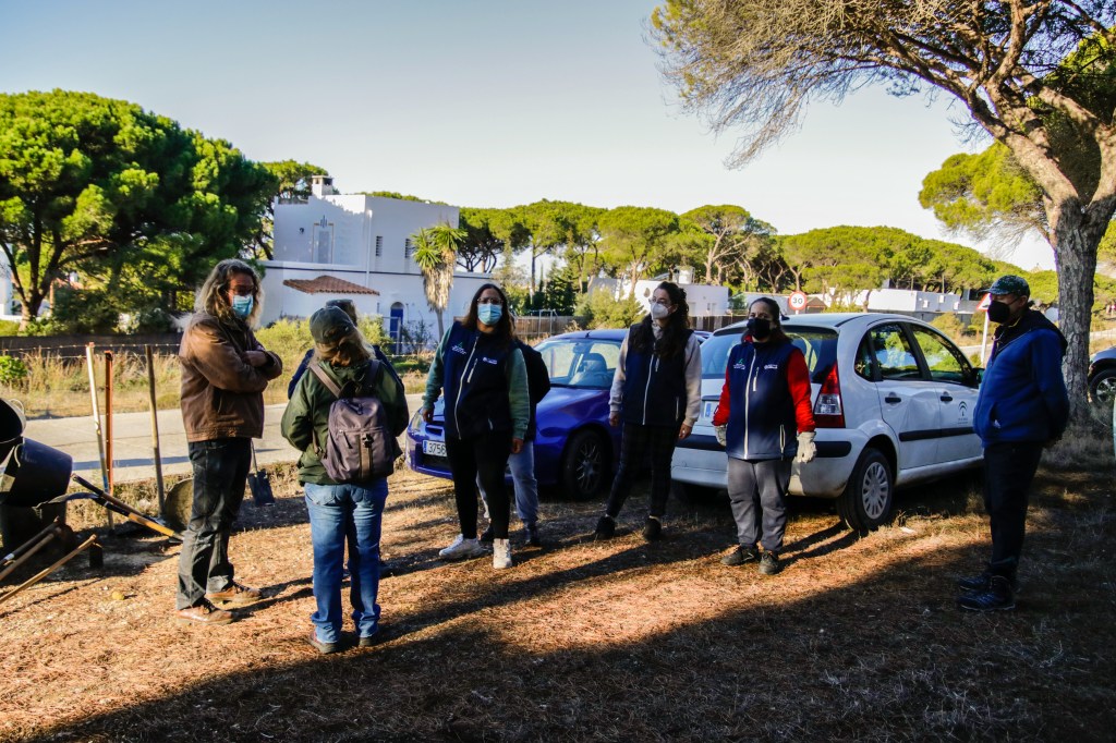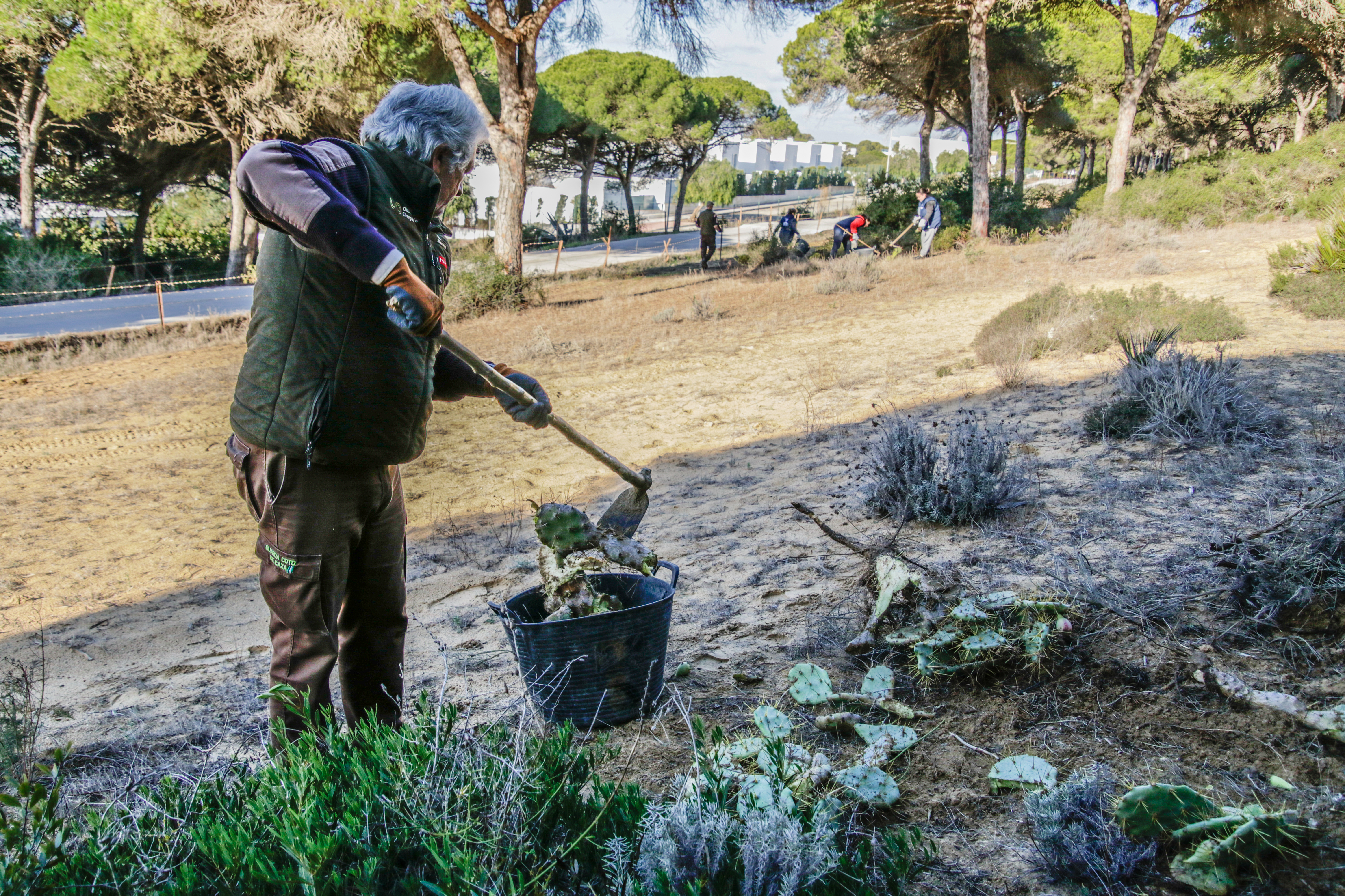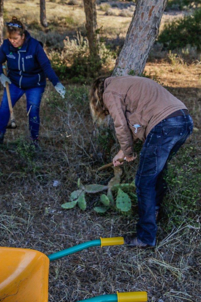 Voluntarios participantes en el Proyecto de retirada de Opuntia dellini en los Caños de Meca, dentro del término del Parque Natural de La Breña y Marismas del Parque junto con Miembros de la Federación de Caza El Cartucho, el Director del Parque y una Técnica del mismo, retiraron más de 150 plantas de Opuntia dellini.Las sinergias entre voluntarios y administración hacen posible una mejor gestión de las actuaciones en los espacios naturales.Sábado 27 de noviembre, jornada práctica de eliminación de especies exóticas autorizada con fecha 24 de noviembre. Actividad, sin incidencias. Asisten 8 miembros de la Asociación, entre los que se encuentran los dos Vigilantes del Coto del Parque , Miembros de la Federación de Caza «El Cartucho»,un técnico del Parque y el Director Conservador. Breve recordatorio aspectos metodológicos del arranque manual de esta especie. Se observaron las buenas prácticas durante la actividad, de forma que se extremaron las precauciones para que nadie saliera dañado, partiendo lo menos posible la planta al arrancarla y evitando el pisoteo innecesario sobre la vegetación. Se hizo una búsqueda y retirada de la planta invasora Opuntia dillenii dispersa a lo largo de la Avenida Trafalgar sita en Los Caños de Meca (TM Barbate), cubriendo una distancia de unos 30 metros desde la alambrada hacia el interior ocupada por pinos y enebros entre otras especies. Se eliminaron más de 150 pies de tamaño mediano y pequeño. Se repaso posteriormente el terreno en busca de posibles restos vegetales capaces de regenerar de nuevo la planta. Además se hizo una limpieza del papel, plástico y vidrio que se fue encontrando. Los residuos se acopiaron junto a la puerta de entrada en el punto acordado con el personal laboral del Parque para su posterior recogida….Con esta actuación se ha controlado una población de esta peligrosa invasora proliferando en un área donde justamente está en marcha una labor de repoblación con enebros. La mayoría de los puntos de proliferación, estaban cercanos a la alambrada y ejemplares juveniles de pequeño tamaño aunque también se encontraron algunos ejemplares de mayor tamaño que no se distinguían a simple vista por crecer dentro de los arbustos….Momentos de los trabajos realizados, corte extrayendo las raíces, subida a las espuertas, traslado hasta el vehículo de la Sociedad Federada, vaciado en un punto de acopio, volver a recoger las espuertas, volver a localizar opuntias y sacarlas con la azada, cargar las cubas y al vehículo, tantas veces como fue necesario. Desde las 10:00 de las mañana hasta las 13:00 horas