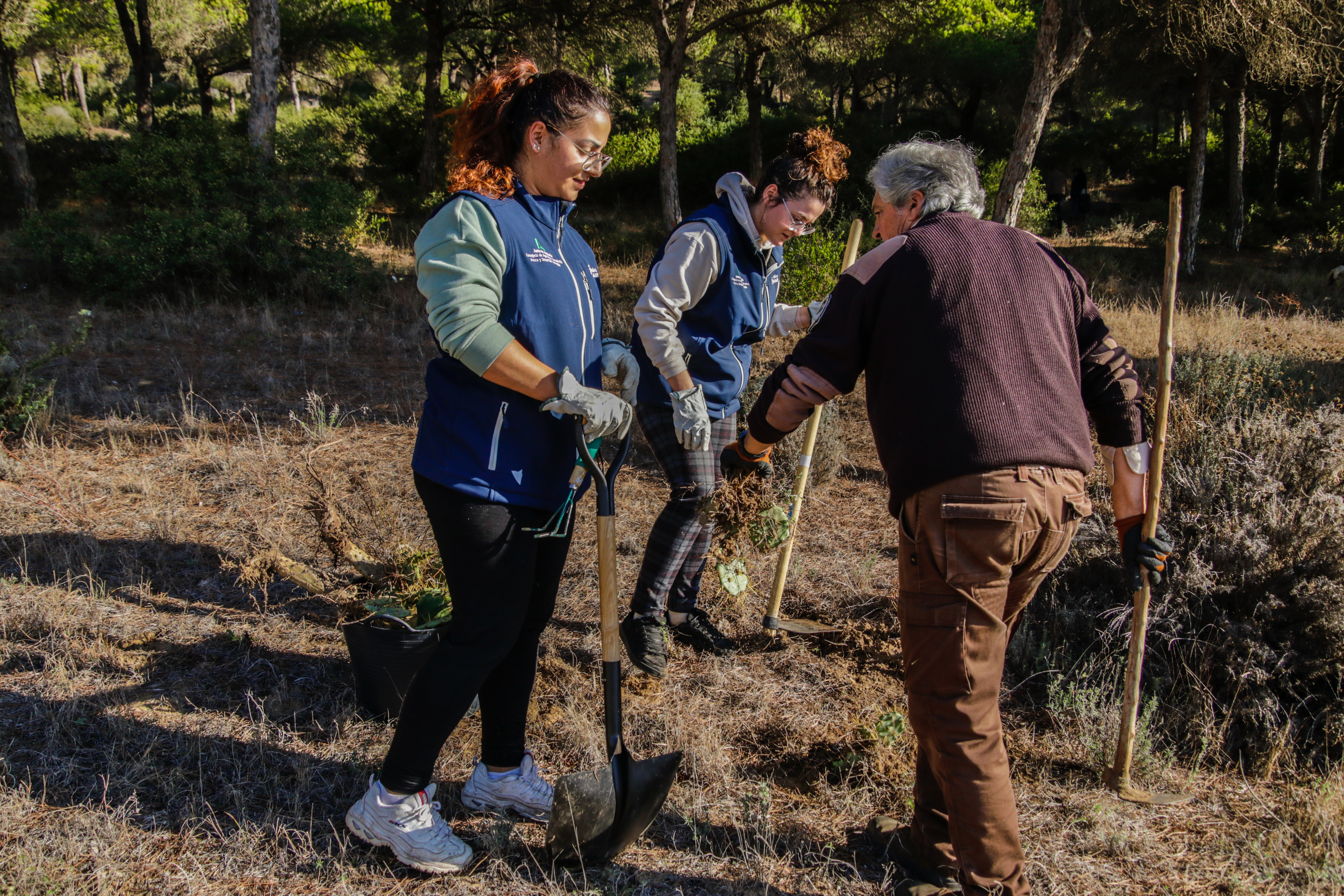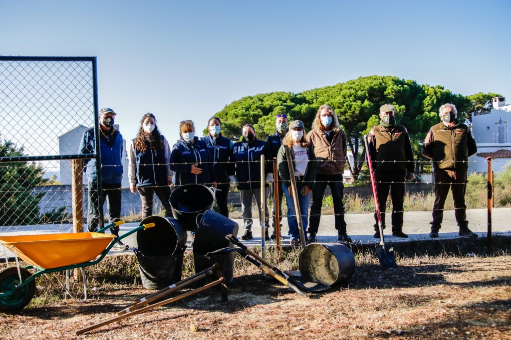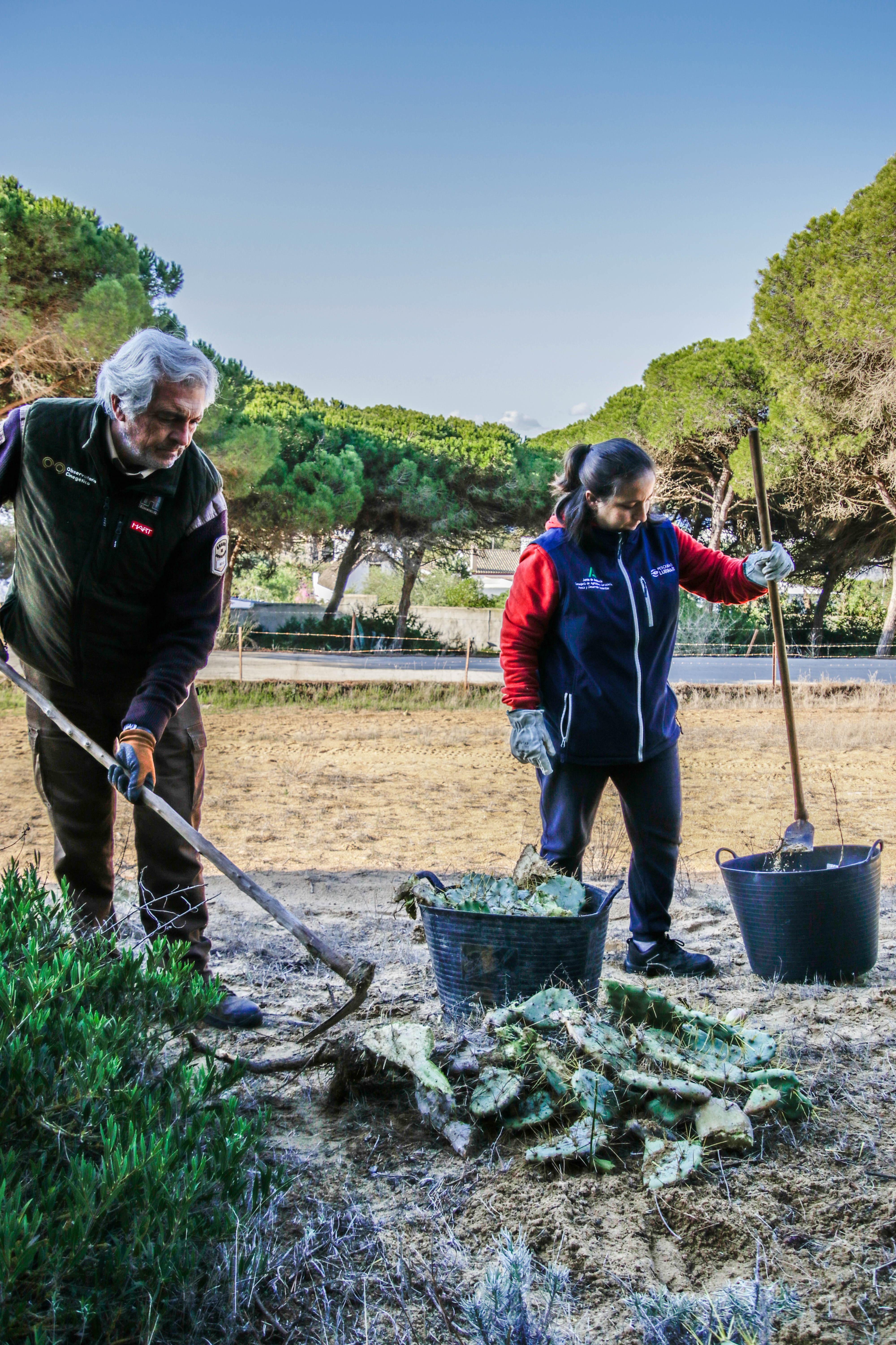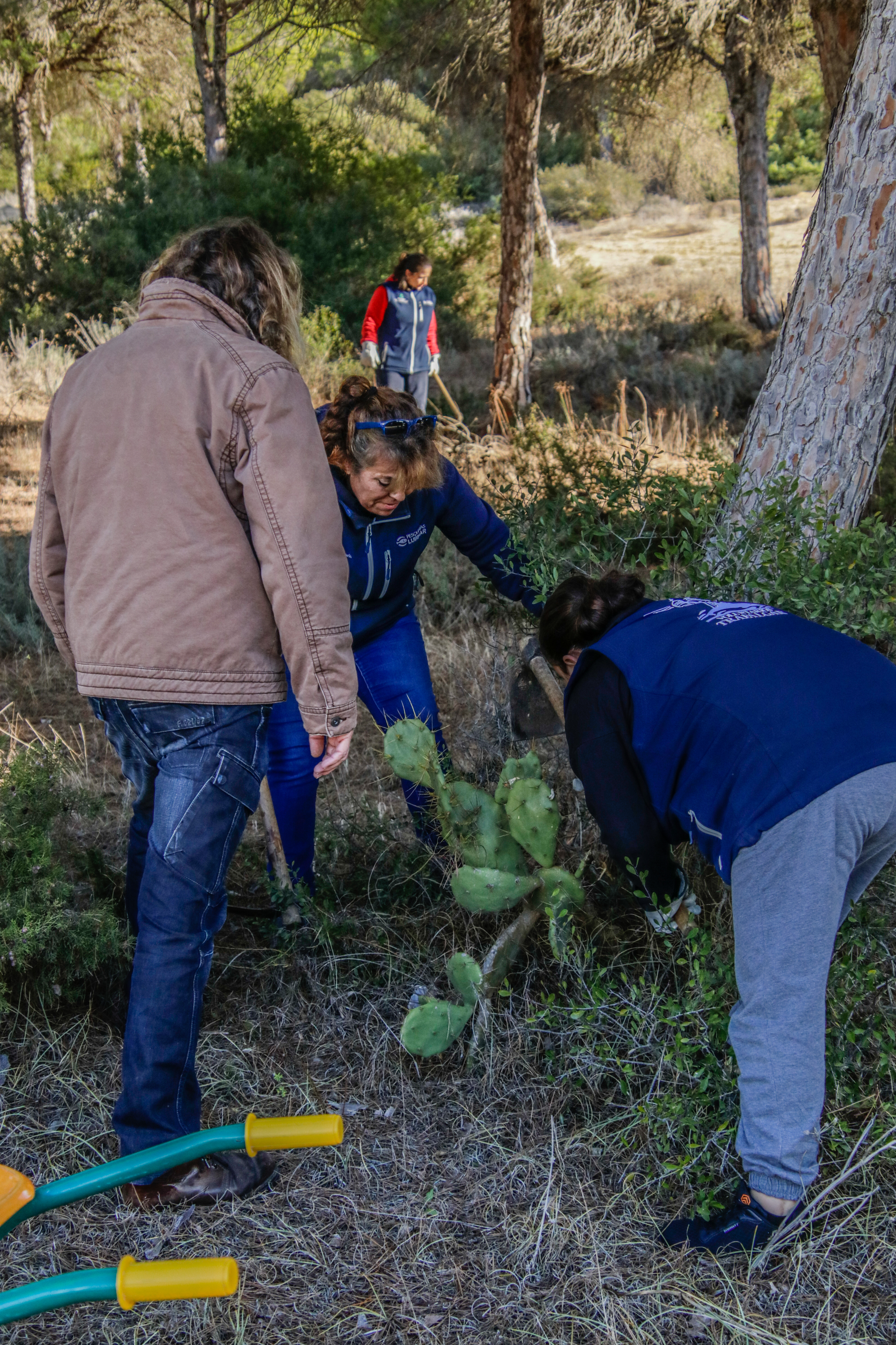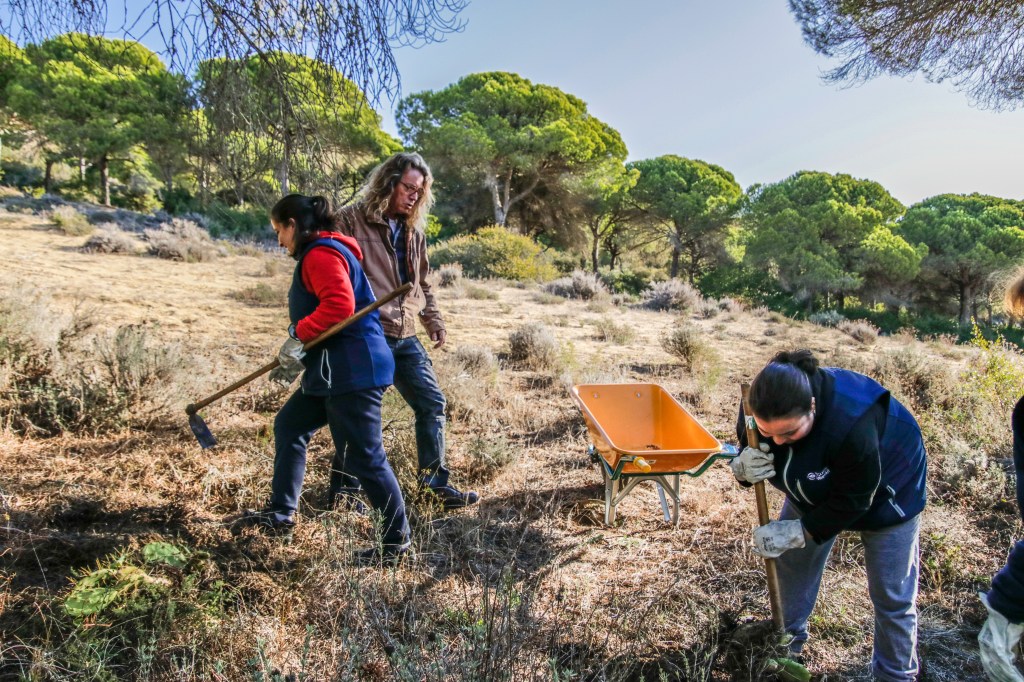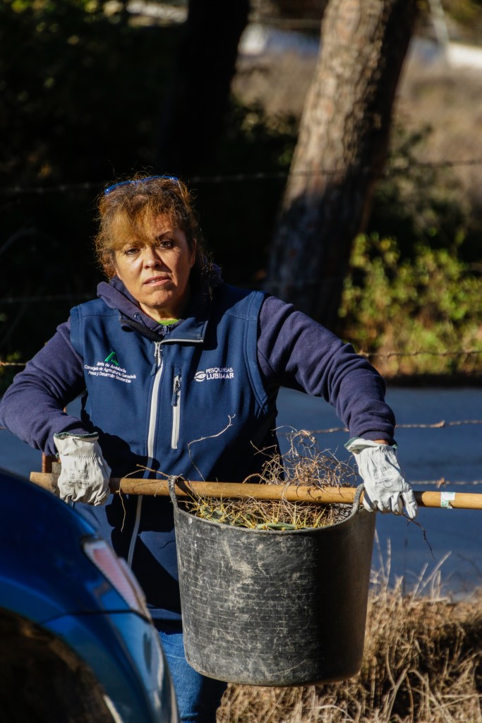 Voluntarios participantes en el Proyecto de retirada de Opuntia dellini en los Caños de Meca, dentro del término del Parque Natural de La Breña y Marismas del Parque junto con Miembros de la Federación de Caza El Cartucho, el Director del Parque y una Técnica del mismo, retiraron más de 150 plantas de Opuntia dellini.Las sinergias entre voluntarios y administración hacen posible una mejor gestión de las actuaciones en los espacios naturales.Sábado 27 de noviembre, jornada práctica de eliminación de especies exóticas autorizada con fecha 24 de noviembre. Actividad, sin incidencias. Asisten 8 miembros de la Asociación, entre los que se encuentran los dos Vigilantes del Coto del Parque , Miembros de la Federación de Caza «El Cartucho»,un técnico del Parque y el Director Conservador. Breve recordatorio aspectos metodológicos del arranque manual de esta especie. Se observaron las buenas prácticas durante la actividad, de forma que se extremaron las precauciones para que nadie saliera dañado, partiendo lo menos posible la planta al arrancarla y evitando el pisoteo innecesario sobre la vegetación. Se hizo una búsqueda y retirada de la planta invasora Opuntia dillenii dispersa a lo largo de la Avenida Trafalgar sita en Los Caños de Meca (TM Barbate), cubriendo una distancia de unos 30 metros desde la alambrada hacia el interior ocupada por pinos y enebros entre otras especies. Se eliminaron más de 150 pies de tamaño mediano y pequeño. Se repaso posteriormente el terreno en busca de posibles restos vegetales capaces de regenerar de nuevo la planta. Además se hizo una limpieza del papel, plástico y vidrio que se fue encontrando. Los residuos se acopiaron junto a la puerta de entrada en el punto acordado con el personal laboral del Parque para su posterior recogida….Con esta actuación se ha controlado una población de esta peligrosa invasora proliferando en un área donde justamente está en marcha una labor de repoblación con enebros. La mayoría de los puntos de proliferación, estaban cercanos a la alambrada y ejemplares juveniles de pequeño tamaño aunque también se encontraron algunos ejemplares de mayor tamaño que no se distinguían a simple vista por crecer dentro de los arbustos….Momentos de los trabajos realizados, corte extrayendo las raíces, subida a las espuertas, traslado hasta el vehículo de la Sociedad Federada, vaciado en un punto de acopio, volver a recoger las espuertas, volver a localizar opuntias y sacarlas con la azada, cargar las cubas y al vehículo, tantas veces como fue necesario. Desde las 10:00 de las mañana hasta las 13:00 horas