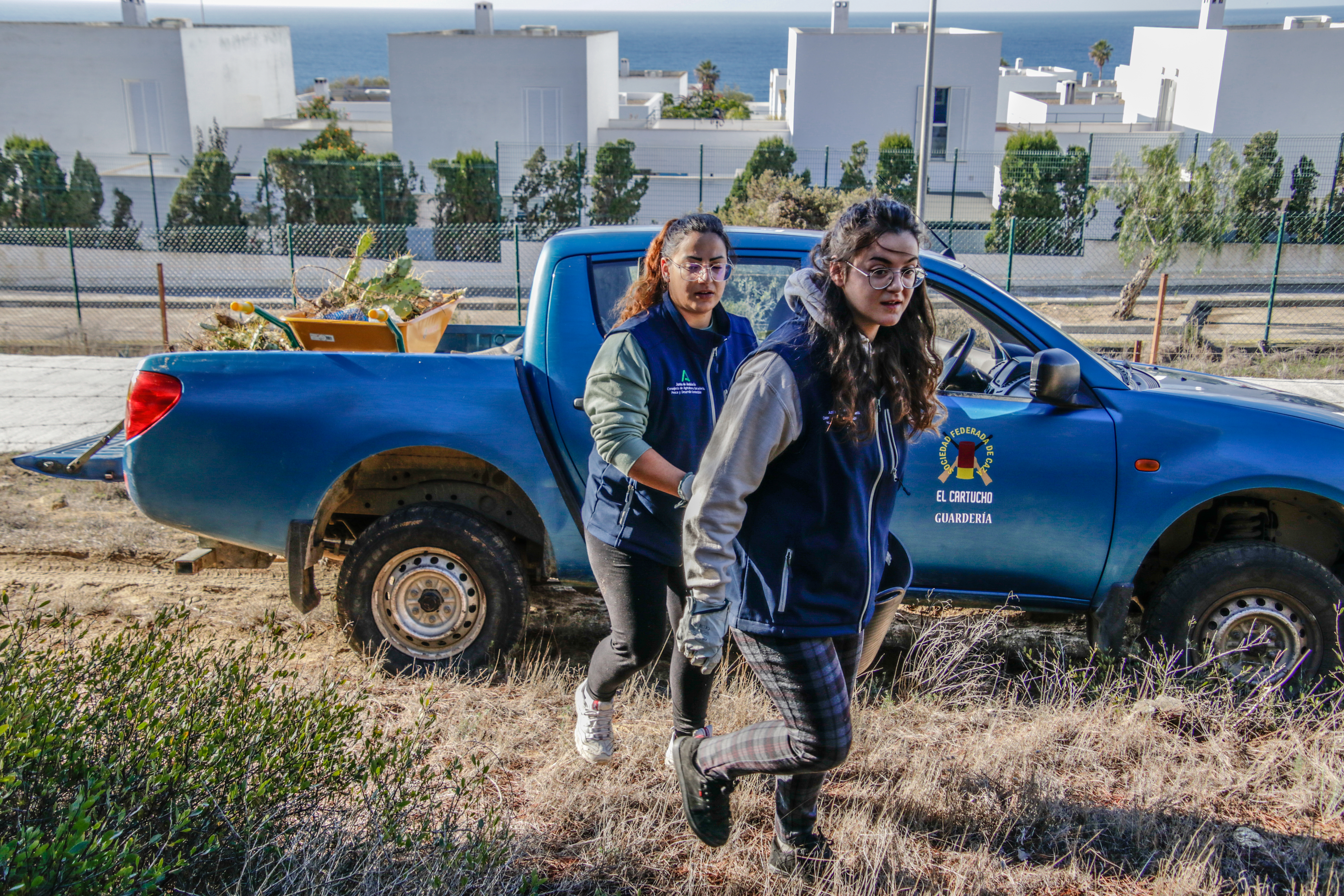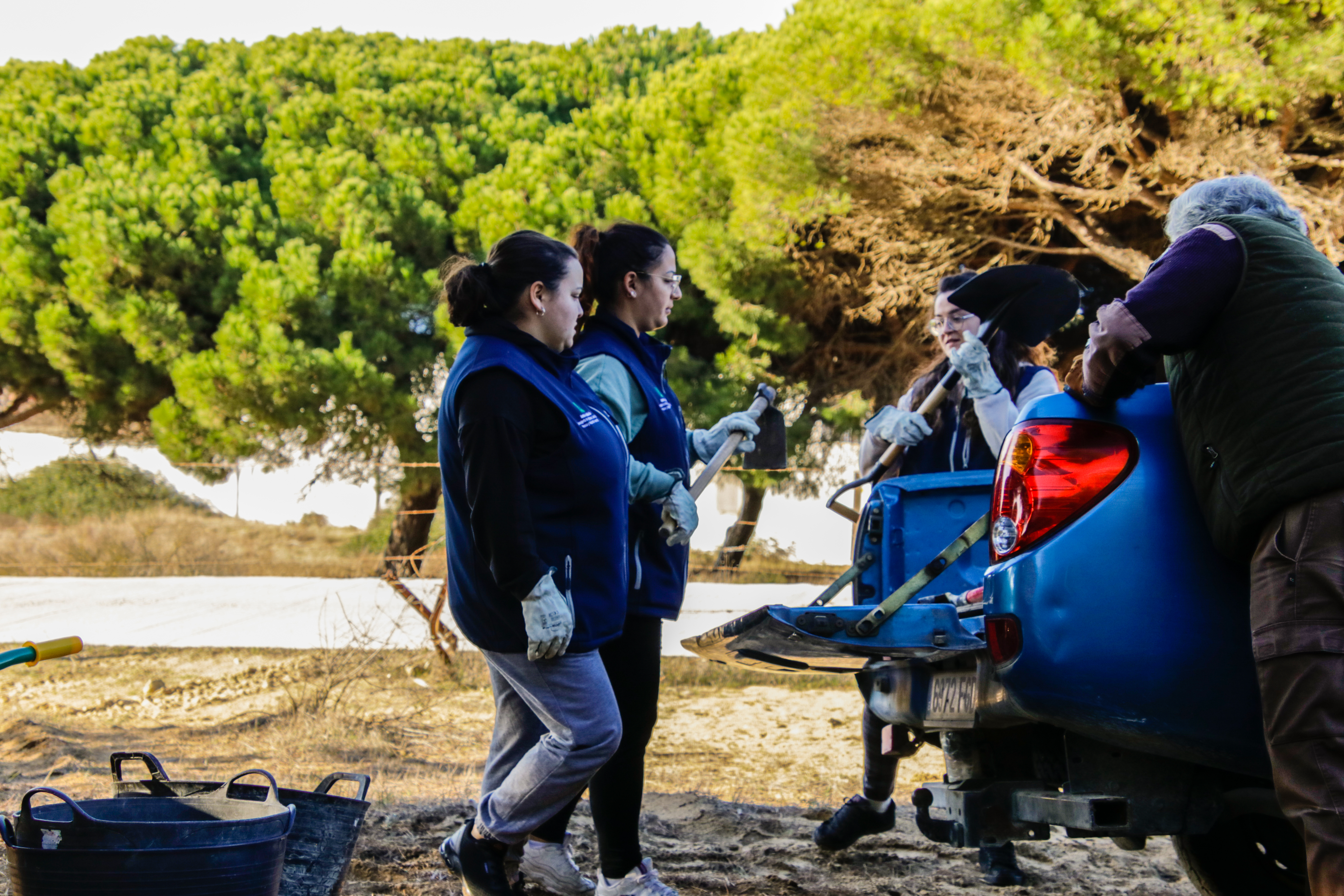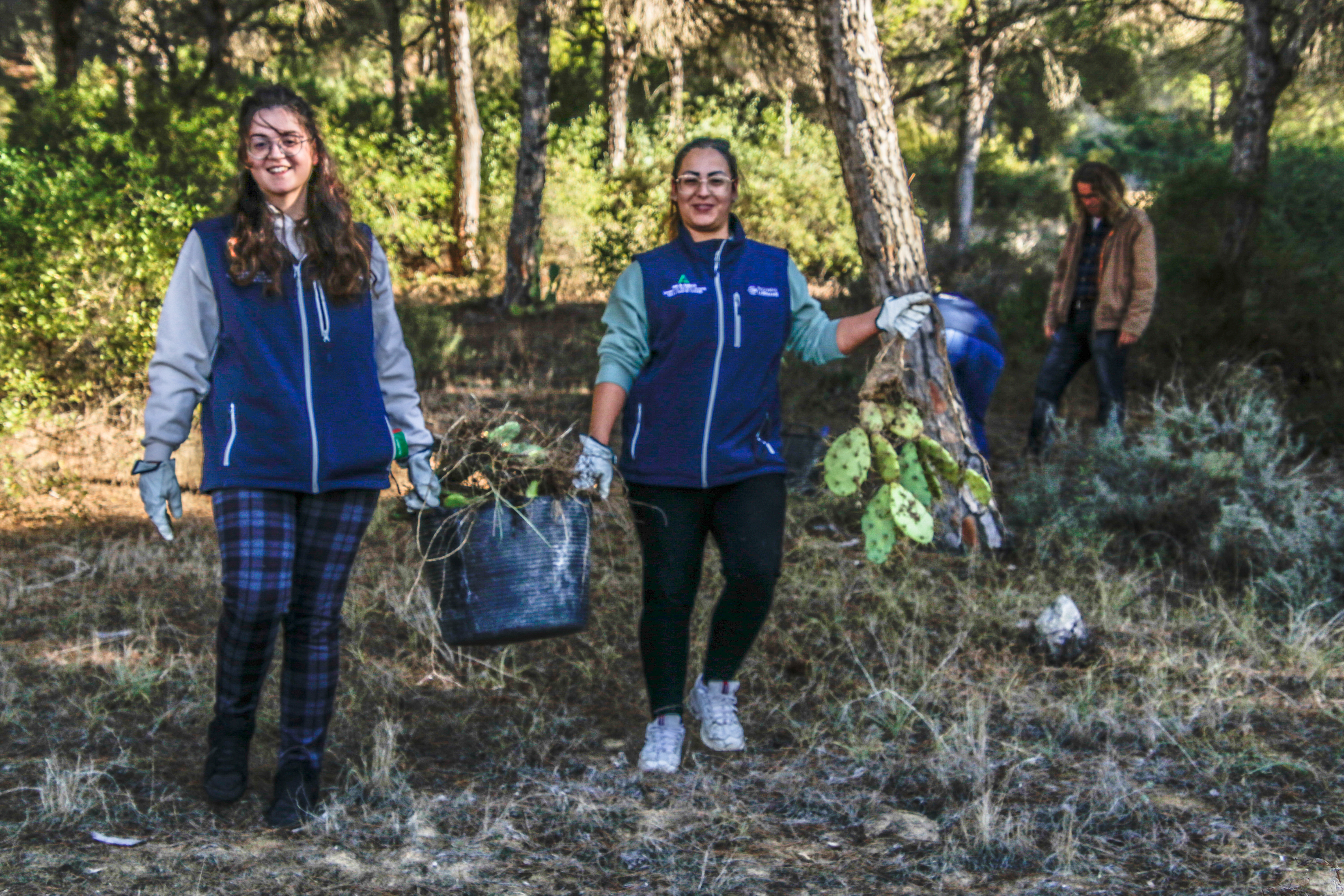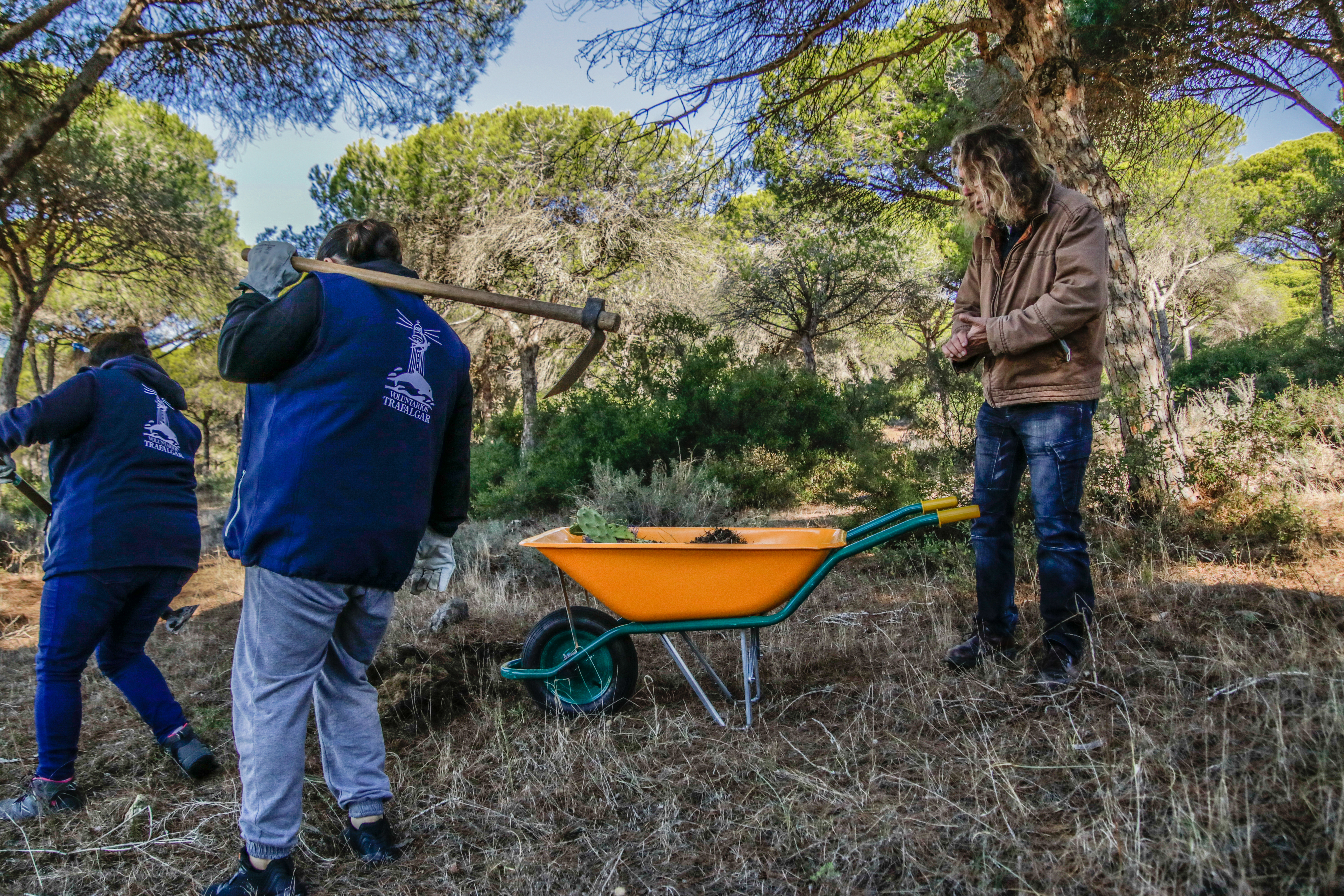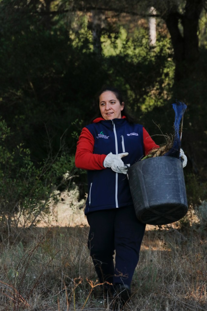 Voluntarios participantes en el Proyecto de retirada de Opuntia dellini en los Caños de Meca, dentro del término del Parque Natural de La Breña y Marismas del Parque junto con Miembros de la Federación de Caza El Cartucho, el Director del Parque y una Técnica del mismo, retiraron más de 150 plantas de Opuntia dellini.Las sinergias entre voluntarios y administración hacen posible una mejor gestión de las actuaciones en los espacios naturales.Sábado 27 de noviembre, jornada práctica de eliminación de especies exóticas autorizada con fecha 24 de noviembre. Actividad, sin incidencias. Asisten 8 miembros de la Asociación, entre los que se encuentran los dos Vigilantes del Coto del Parque , Miembros de la Federación de Caza «El Cartucho»,un técnico del Parque y el Director Conservador. Breve recordatorio aspectos metodológicos del arranque manual de esta especie. Se observaron las buenas prácticas durante la actividad, de forma que se extremaron las precauciones para que nadie saliera dañado, partiendo lo menos posible la planta al arrancarla y evitando el pisoteo innecesario sobre la vegetación. Se hizo una búsqueda y retirada de la planta invasora Opuntia dillenii dispersa a lo largo de la Avenida Trafalgar sita en Los Caños de Meca (TM Barbate), cubriendo una distancia de unos 30 metros desde la alambrada hacia el interior ocupada por pinos y enebros entre otras especies. Se eliminaron más de 150 pies de tamaño mediano y pequeño. Se repaso posteriormente el terreno en busca de posibles restos vegetales capaces de regenerar de nuevo la planta. Además se hizo una limpieza del papel, plástico y vidrio que se fue encontrando. Los residuos se acopiaron junto a la puerta de entrada en el punto acordado con el personal laboral del Parque para su posterior recogida….Con esta actuación se ha controlado una población de esta peligrosa invasora proliferando en un área donde justamente está en marcha una labor de repoblación con enebros. La mayoría de los puntos de proliferación, estaban cercanos a la alambrada y ejemplares juveniles de pequeño tamaño aunque también se encontraron algunos ejemplares de mayor tamaño que no se distinguían a simple vista por crecer dentro de los arbustos….Momentos de los trabajos realizados, corte extrayendo las raíces, subida a las espuertas, traslado hasta el vehículo de la Sociedad Federada, vaciado en un punto de acopio, volver a recoger las espuertas, volver a localizar opuntias y sacarlas con la azada, cargar las cubas y al vehículo, tantas veces como fue necesario. Desde las 10:00 de las mañana hasta las 13:00 horas